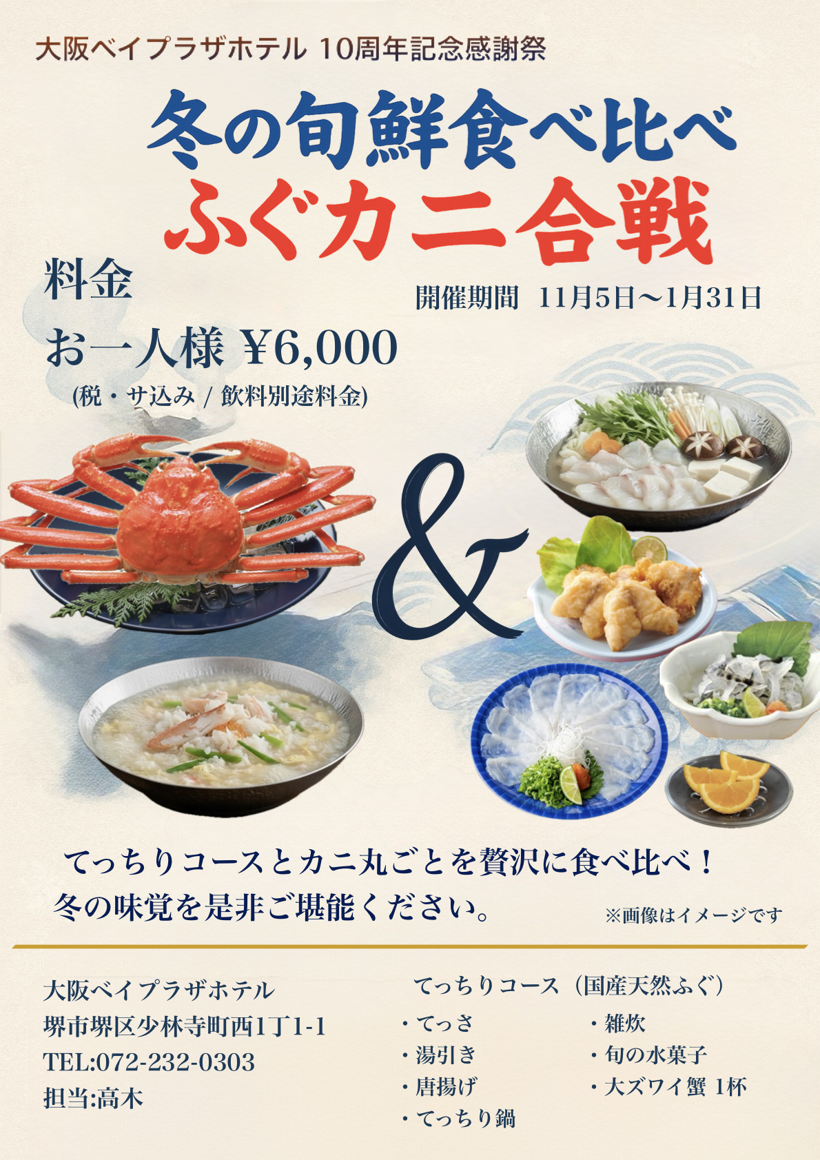 大阪ベイプラザホテル10周年を記念し、冬の旬鮮ふぐカニ合戦を開催いたします。 お客様に支えられて迎えたこの節目に、国産の天然ふぐとカニを大放出! てっちりコースとカニ丸ごと1杯を味わう至福のひと時を、心ゆくまでお楽しみください。